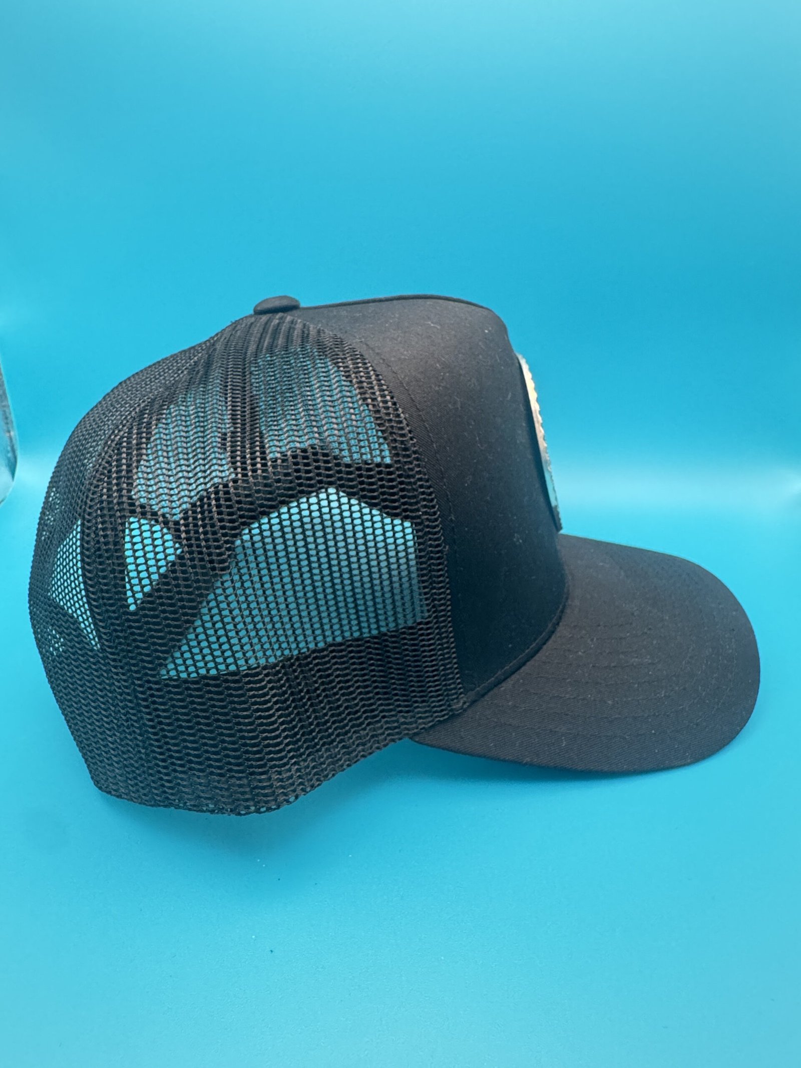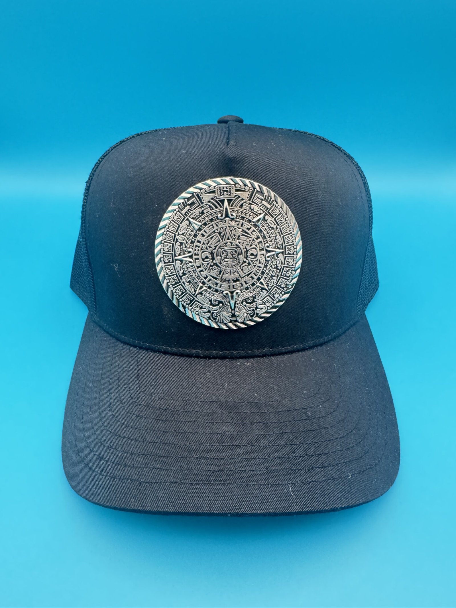 Add an effortless touch to your outfit with this black cotton blend cap. It features a soft black base with an Aztec metal symbol and a mesh back for a comfortable, breathable fit. Perfect for an elevated casual streetwear look.