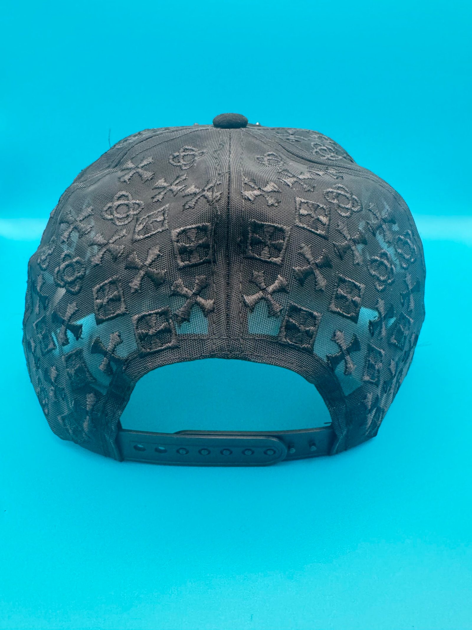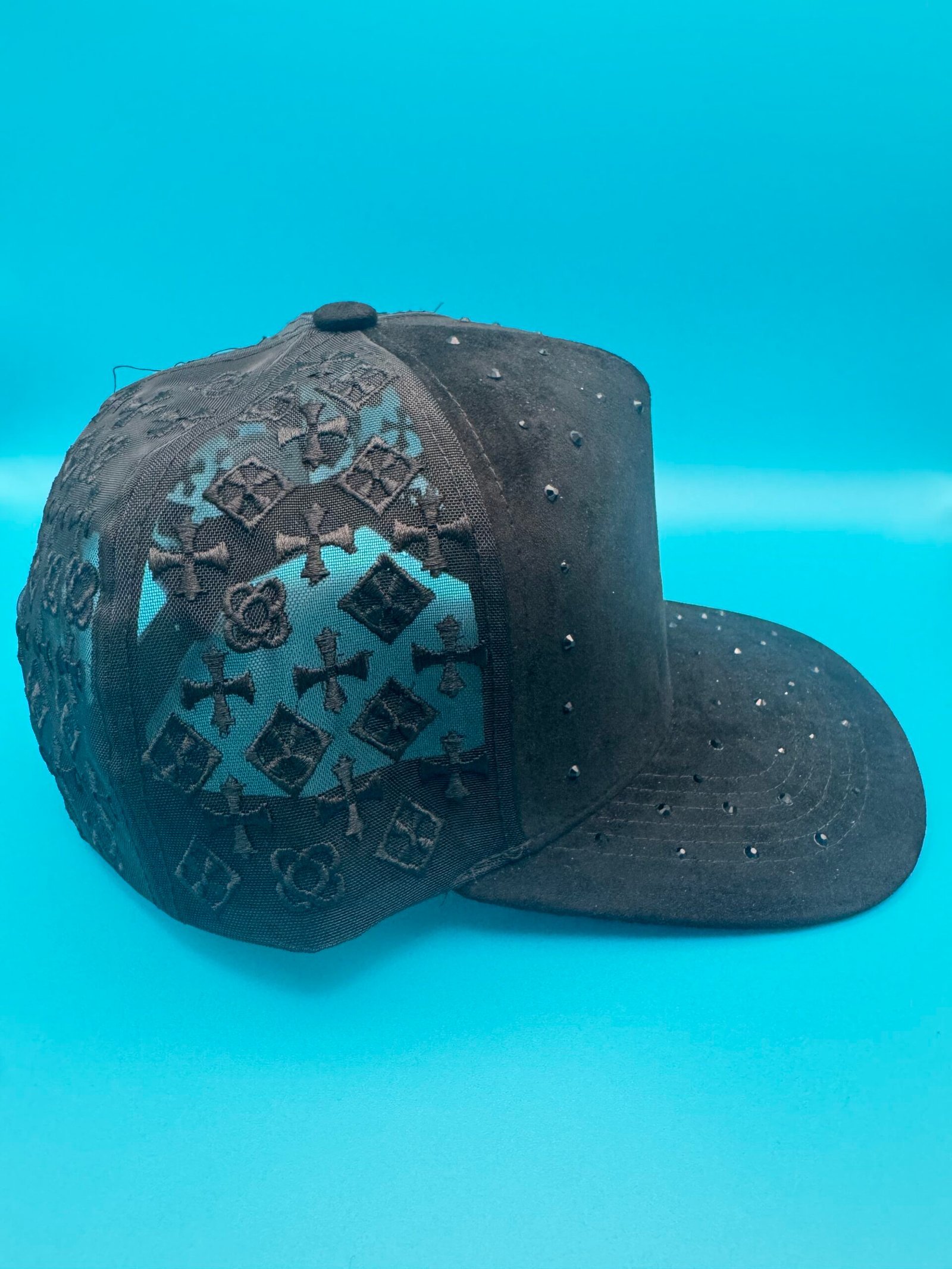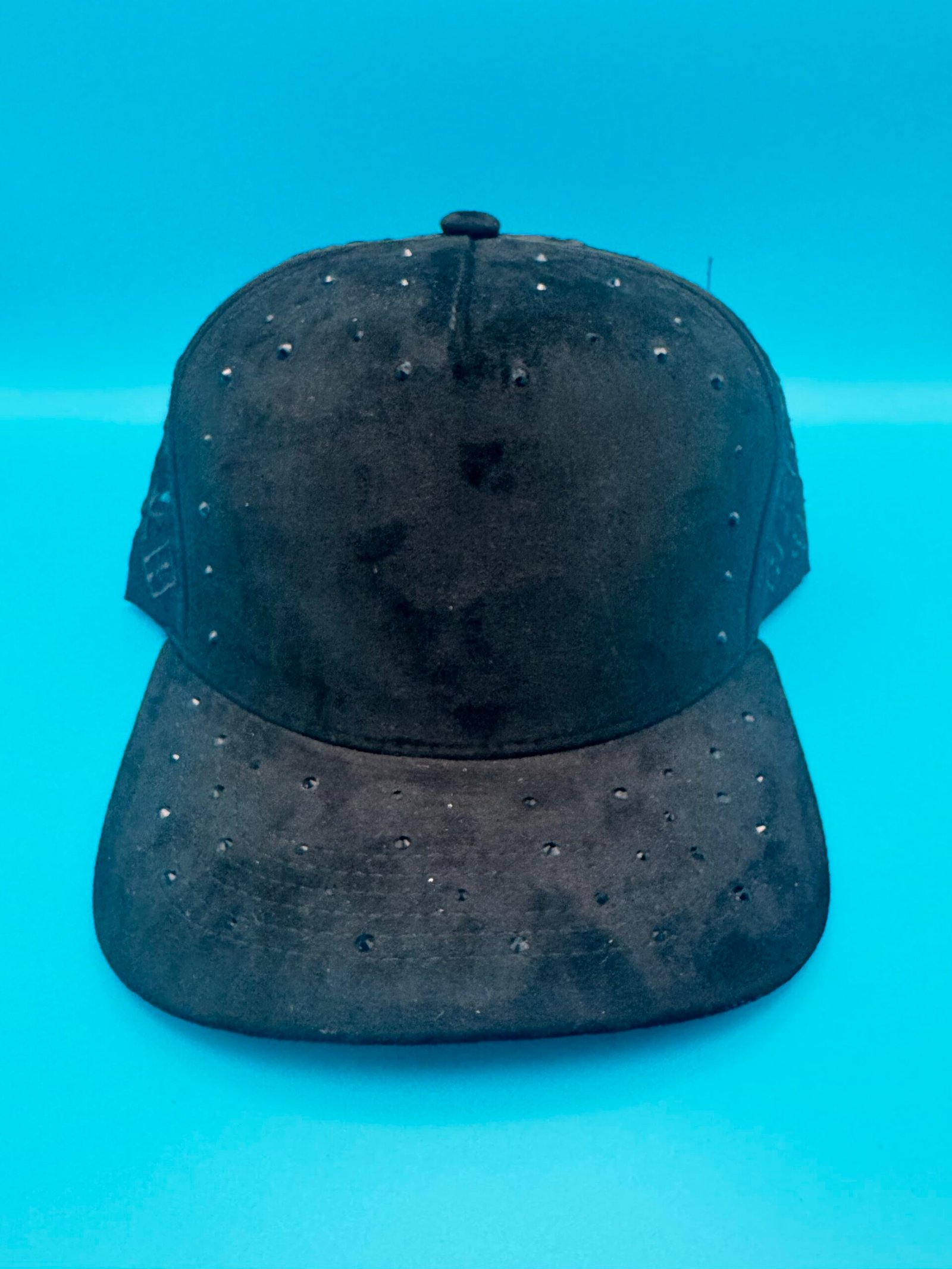 Keep it sleek and stylish with this black suede mesh cap featuring rhinestone accents. The front is soft suede with scattered rhinestones for just the right amount of shine, while the back has a mesh embroidered design for a trendy, breathable finish. It’s the perfect statement piece for any casual outfit.